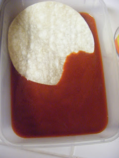 I went with corn tortillas because I am trying to stay away from white flour and sugar for my New Years Resolution (we'll see how long that lasts!) So look forward to some healthy recipes in the near future. Dip your tortilla in a red enchilada sauce. Side note I have used the uncooked tortillas from Costco which is really good but time consuming. When my husband wants those kind of tortillas I make him cook them up for me while I shred the chicken. P.S. if you use corn tortillas remember to heat them up first otherwise they will crumble and fall apart.